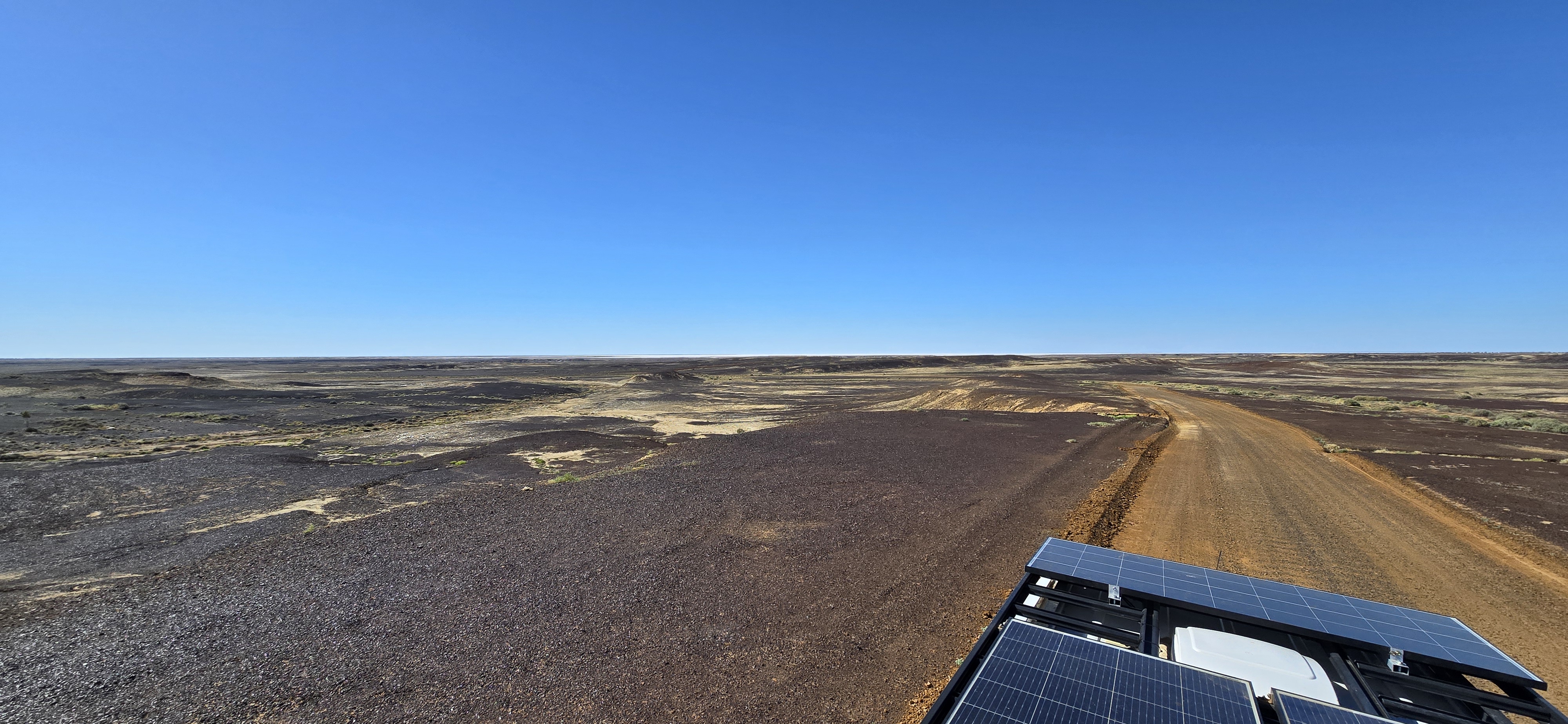 The van and I made it to a dip where a small salt lake had formed. The road smoothed out. I pulled over, took a large breath, and went for a walk. As I was crunching my way over the salted ground I looked up and noticed another traveller had stopped behind me. They were letting more air out of their tyres. I took the inspiration to do the same and got going again. Since the tyres had much less pressure now, almost half of the standard, the journey was relatively smoother – I could almost do fourty. Only six hundred klicks remaining.