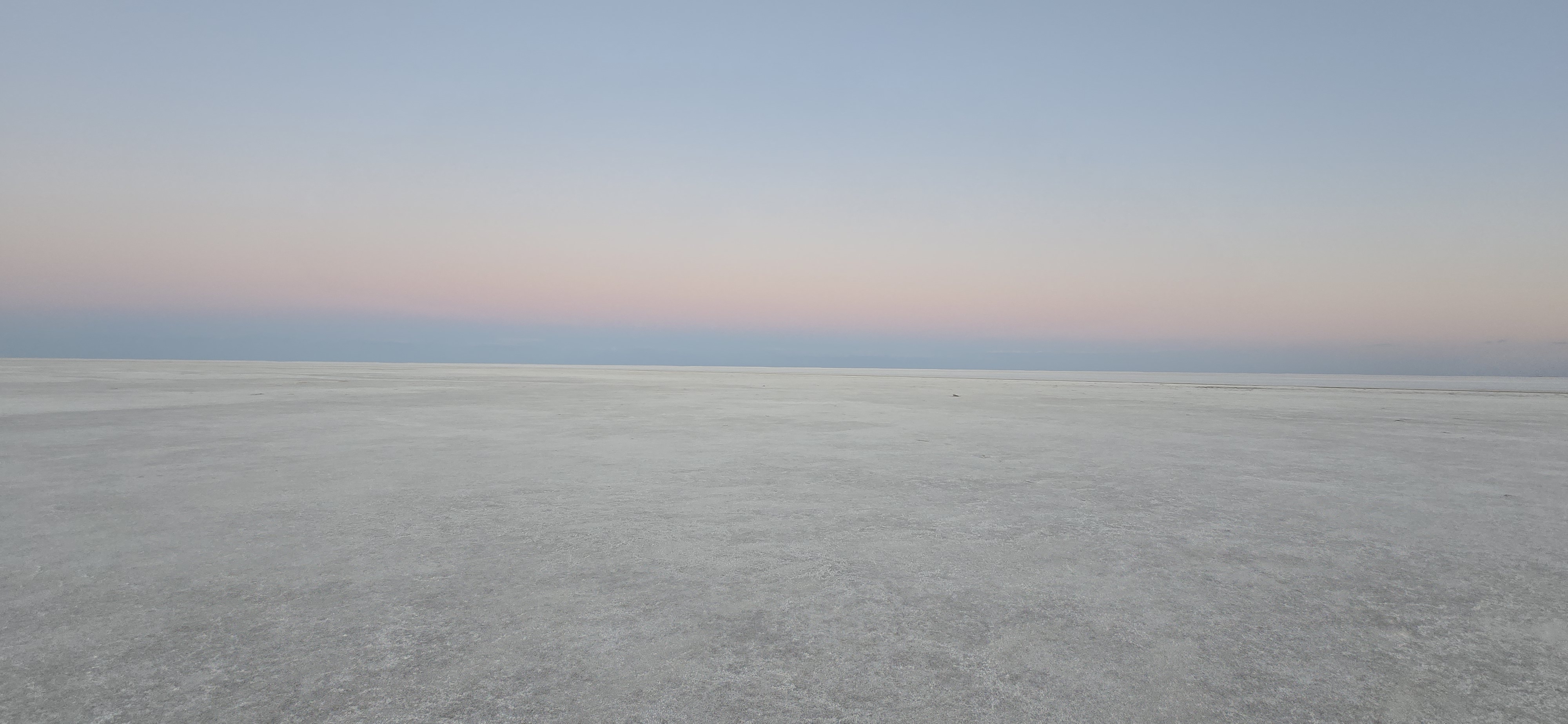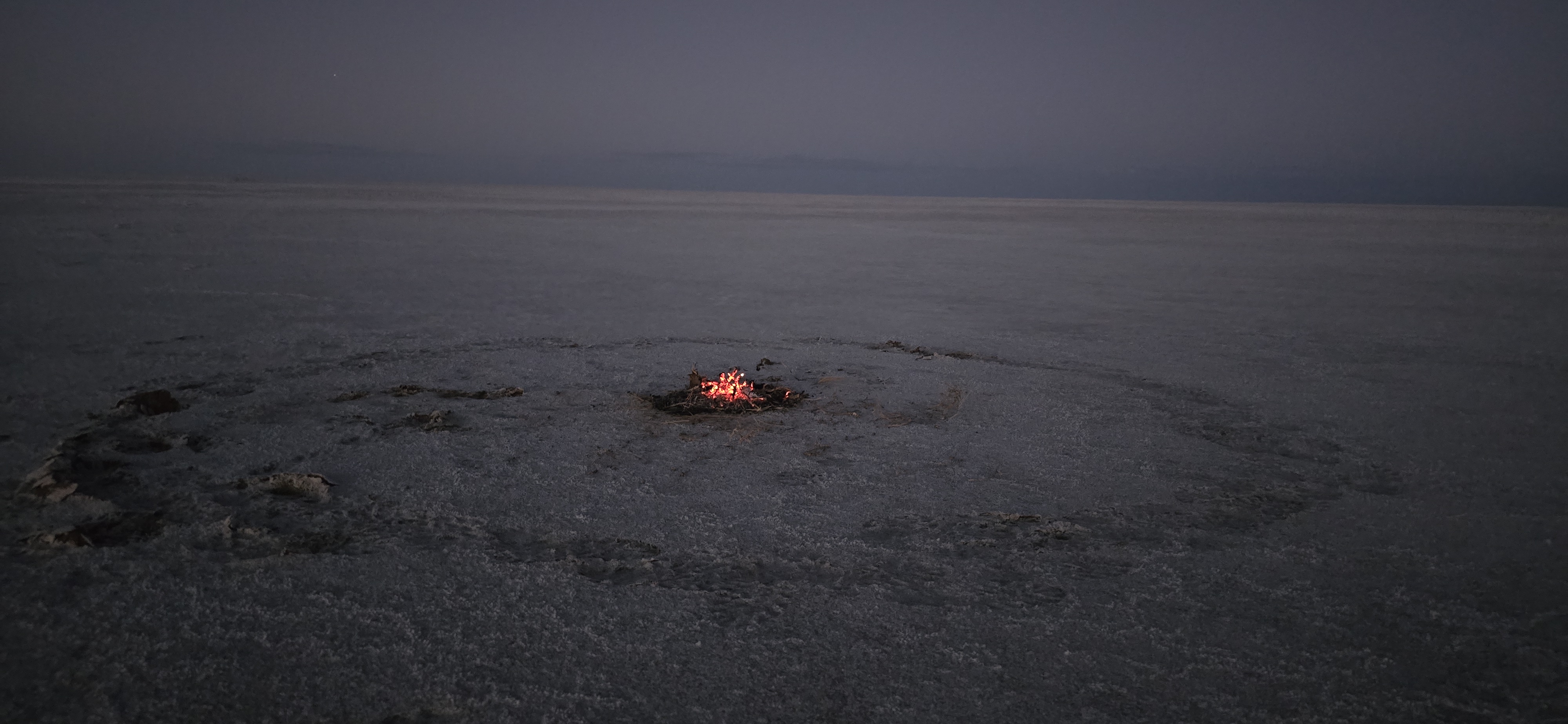 The afternoon sky was mostly covered by a haze of cloud. My gaze took in the majesty of formlessness. Where the horizon of the lake ended, a mild straight-line shimmer existed before the appearance of cloud, there was hardly a break between the white of the salt and the white of the sky. After the sun began to set behind the lake and I, this horizon glowed subtle peach and cobalt hues. I took some dead grass and shrub from the coastline, had a small fire a few hundred metres from the shore, and played my drum until nightfall.
