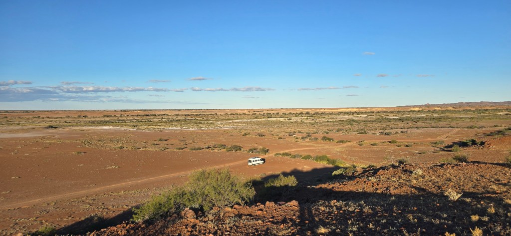 After an hour of driving, the road got rough, and I started to struggle. The van could go no faster than twenty and there was no way I could escape the corrugations. Like innumerable sandy waves jolting the van and jarring my body. I found no peace and no place to rest. Yet, I had to keep going before a suitable camp would reveal itself.