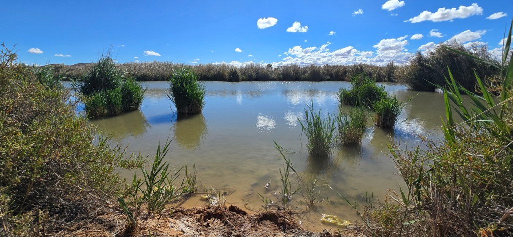 My walk took me through an area littered with springs. From barren desert rock burst large rushes and trees. Upon investigation, one spring was found at the base of a rocky hill, sitting silently in a circle of volcanic rock. Green contrasted the reds, yellows, and whites, and brought a smile to my heart.
