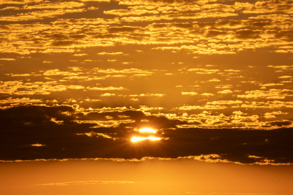 I spent the morning watching the sunrise from the roof deck. A slow lightening, a bulbous protrusion of colour. Then, a spark, an ignition, I felt my body shift and awaken in resonance with the sun. The globe rose before my eyes and lit the dappled clouds in a heavenly golden glow. The clouds diffused the light and transformed the entire sky to this warm vibrant colour, while soft beams from sun edge pushed their way through to my vision.